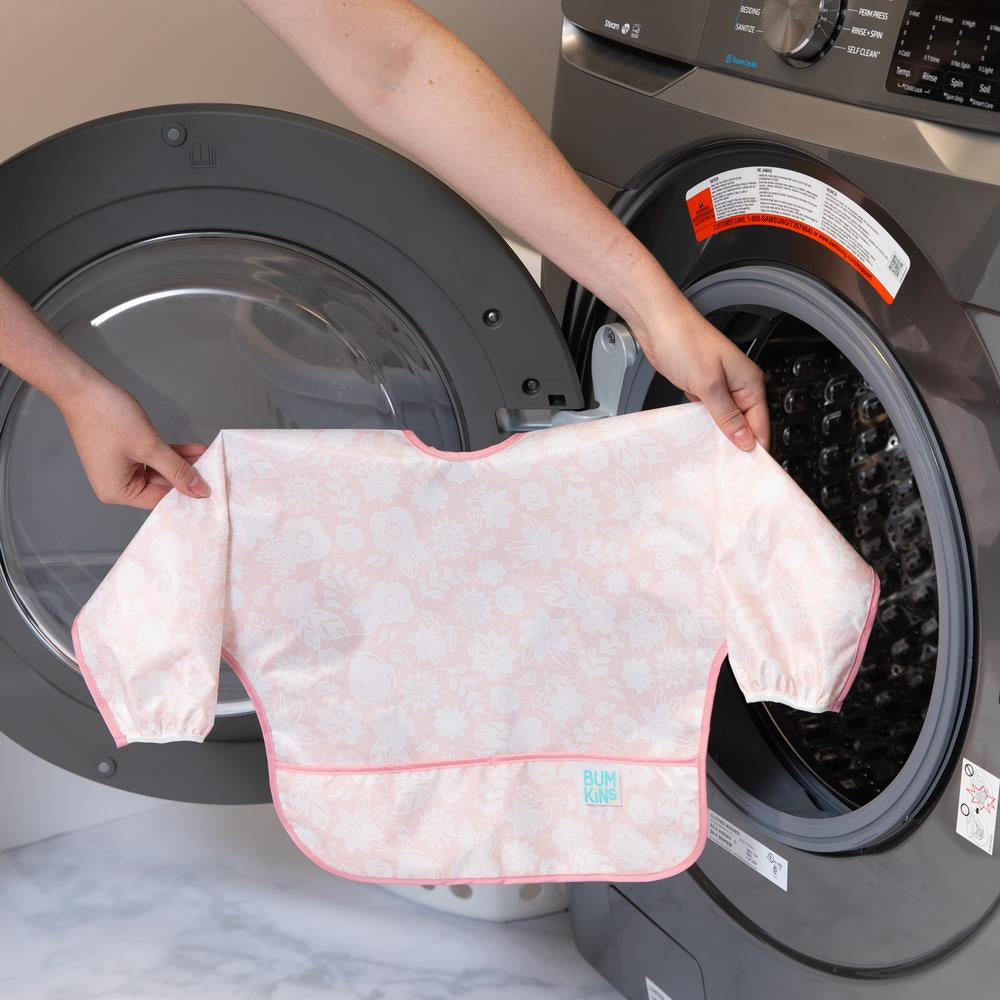 The Bumkins Sleeved Bib saves one outfit at a time. With a handy crumb catcher / catch-all pocket for containing spills. Generously sized and made from Bumkins lightweight, waterproof, easy-wipe, stain and odor resistant fabric. Single ply construction means no worrying about icky stuff growing between layers of fabric. Without a cotton layer, stains and smells don't stick. Adjust the fit with a back-tie closure and adjust sleeve length with elasticized cuffs. Wipeable and machine washable for easy cleaning so you can use it over and over again!
