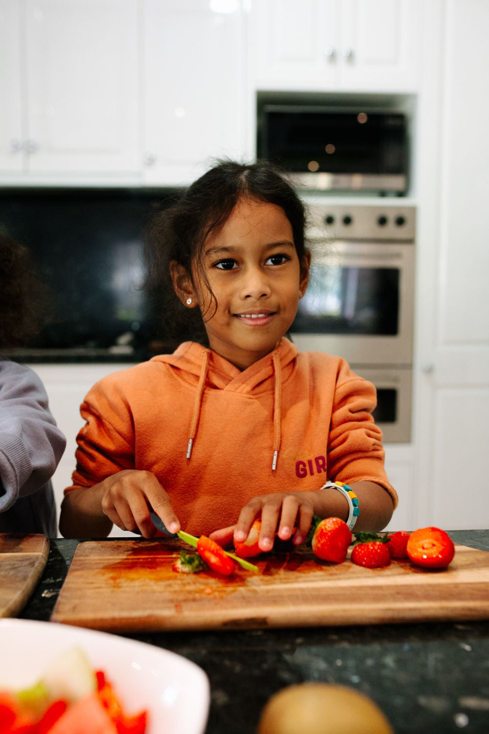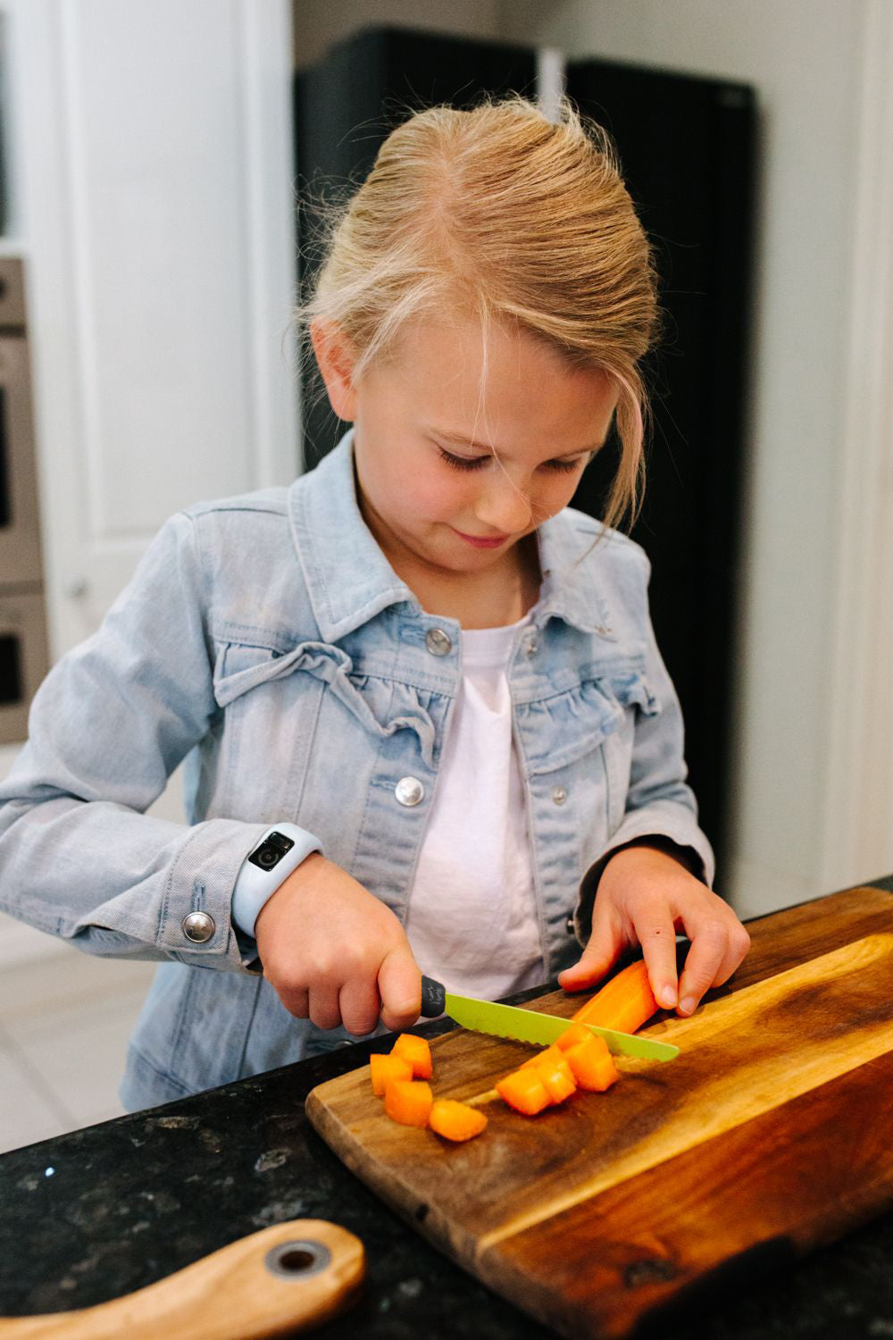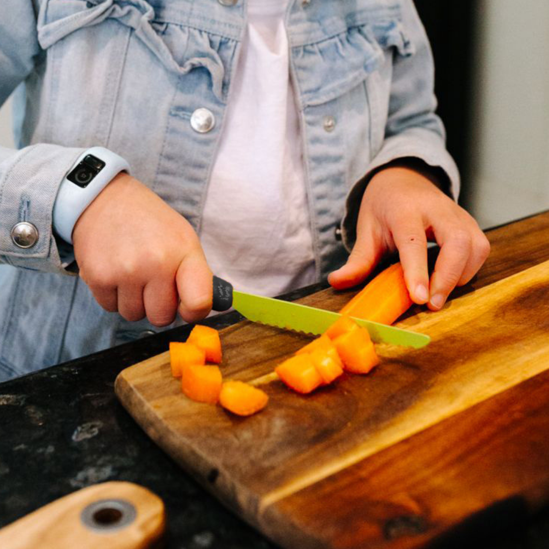 A children’s safe knife that cuts fruit and vegetables but not little fingers. The longer, thinner blade of the Foost Next knife, allows children to cut food with a chopping action.