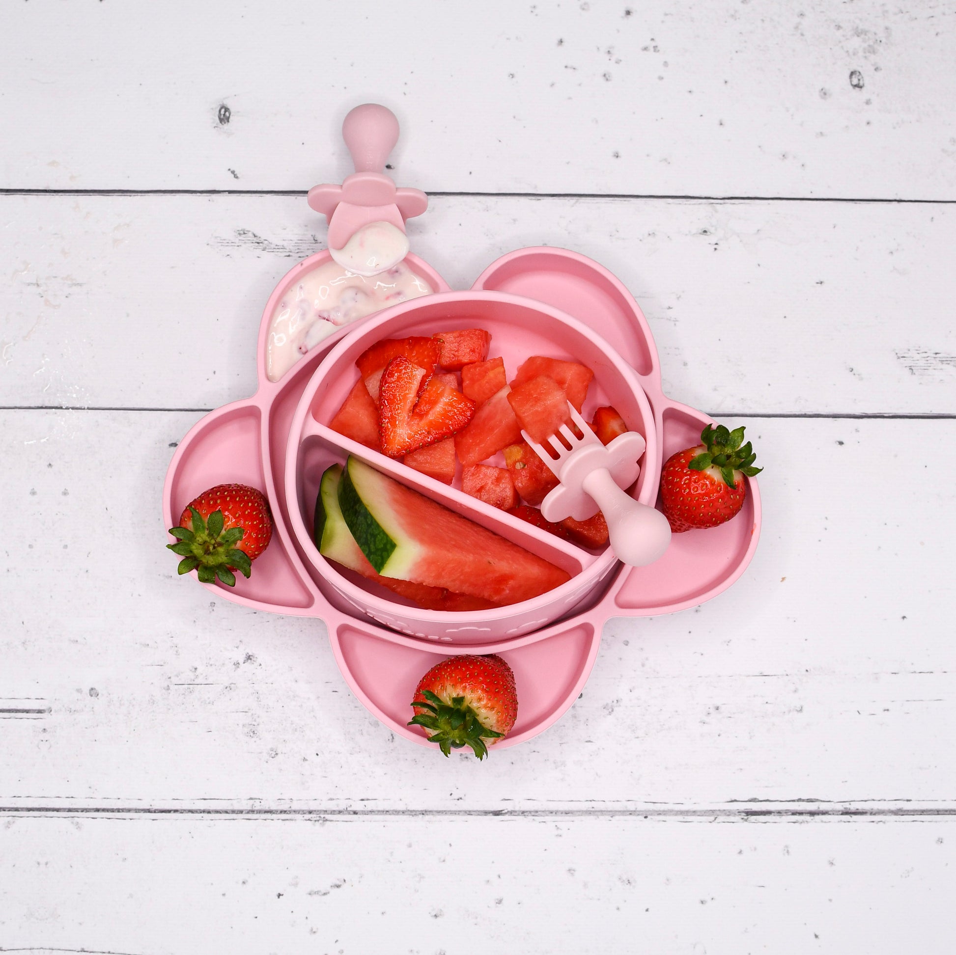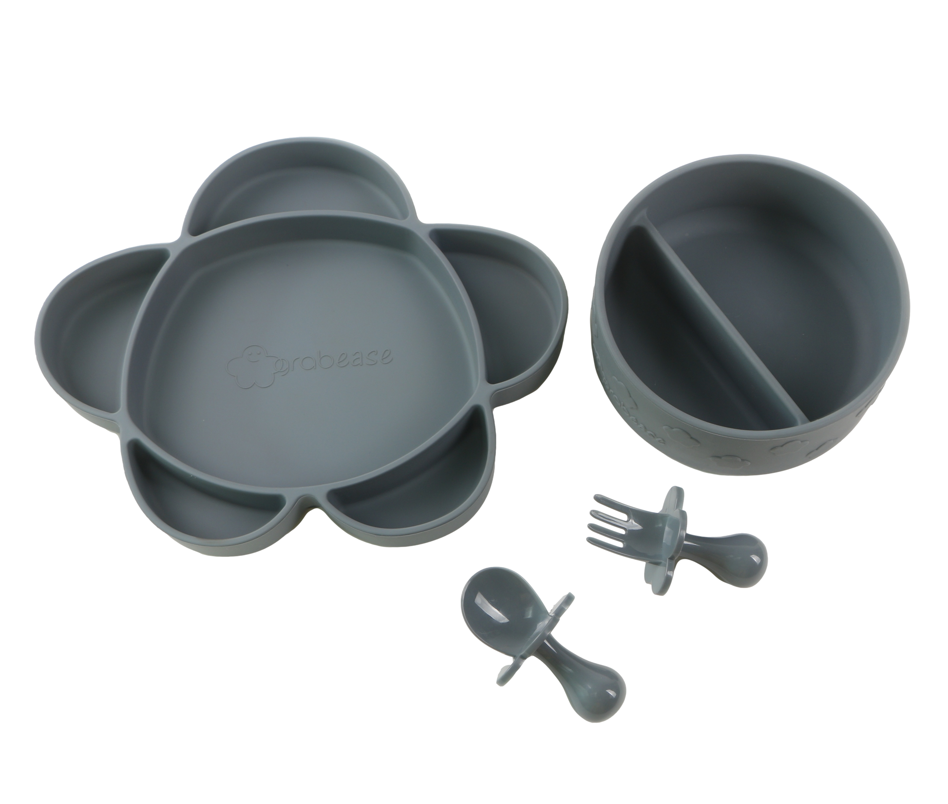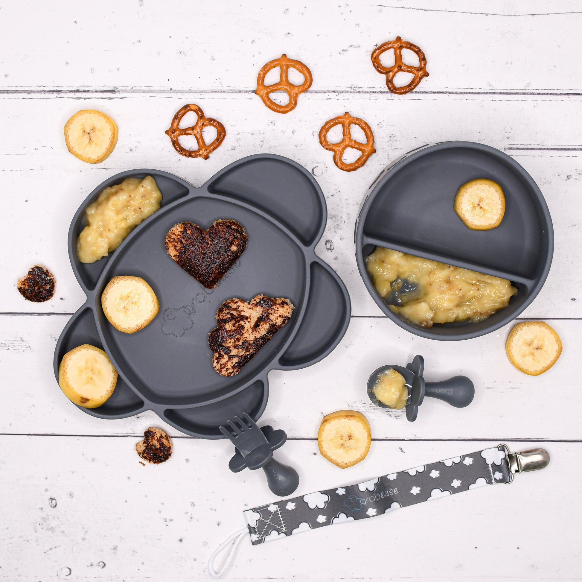 The Grabease Baby Feeding Set is perfect for new babies starting solids. Each set includes a divided suction plate, divided suction bowl and our award-winning self-feeding fork and spoon set.