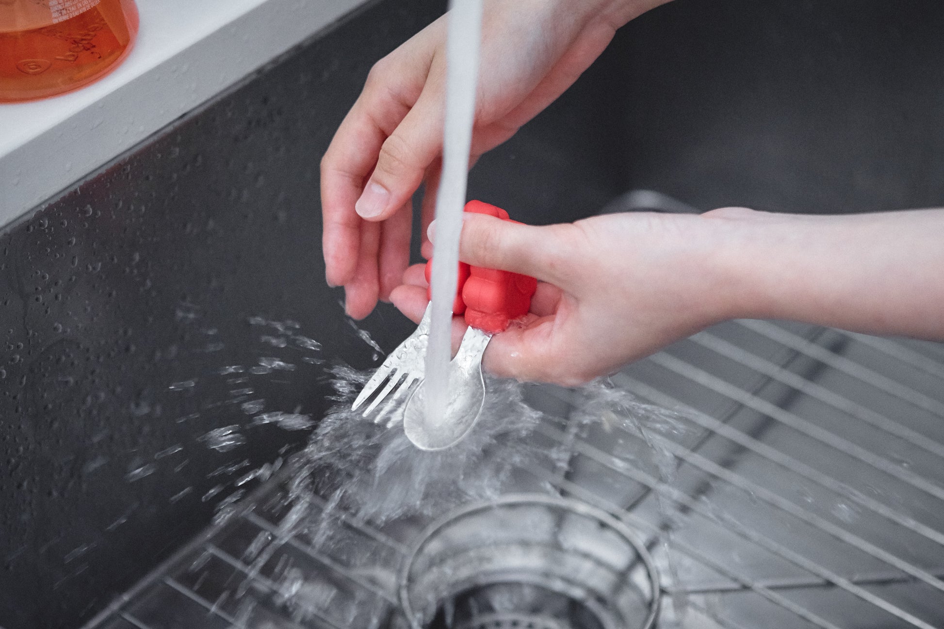 Marcus & Marcus shortened their regular fork and spoon set and turned the handle 90 degrees so the utensils fit more easily into a toddler's palm grip.