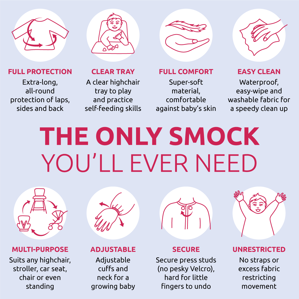 With a Messy Mealtime Smock, babies have full access to their highchair tray to develop their self-feeding/fine motor skills.