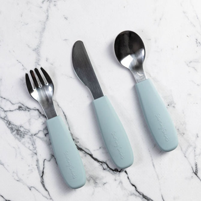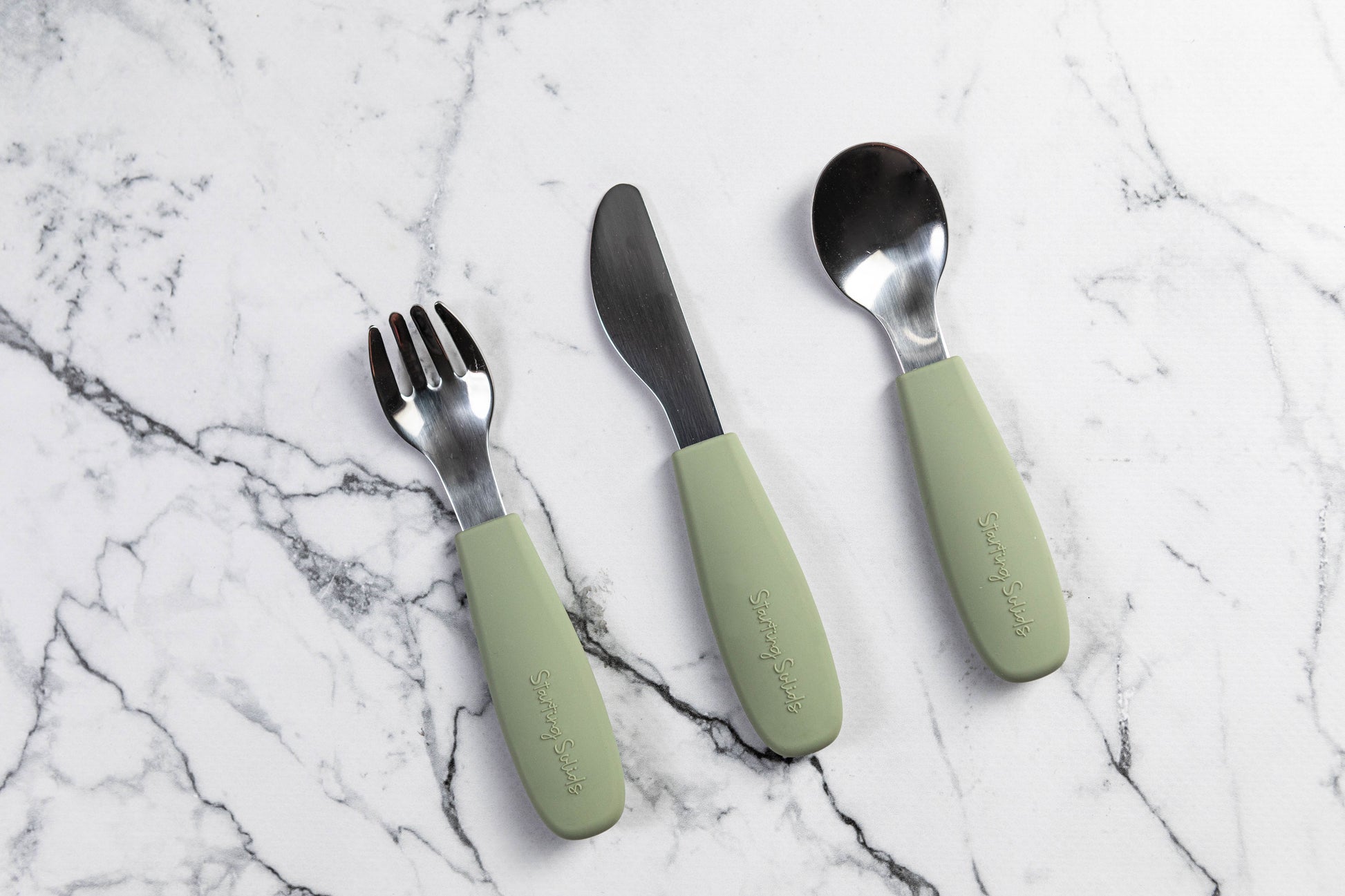 Starting Solids ‘Big Kid’ silverware has been purposefully designed for big kids with little hands. This silverware is the perfect stepping stone from our Toddler Silvies when your little one is ready for a knife but not quite ready for the larger sets on the market. This set come with a fork, knife and spoon.